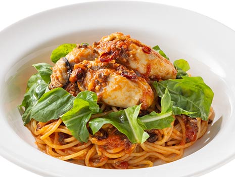 プリっとした瀬戸内海産牡蠣を定番のアラビアータにし、且つオリーブ・ケーパー・アンチョビなどを使用したタプナードを入れ、濃厚な味わいに仕上げました。