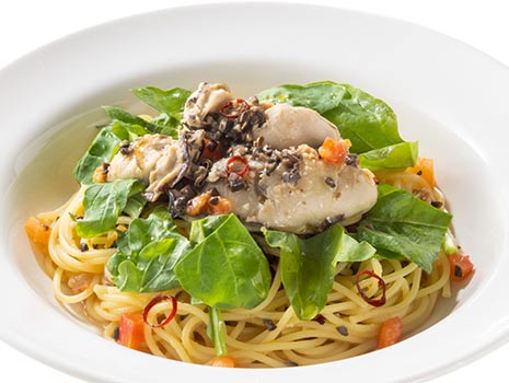 瀬戸内海産牡蠣とオリーブ・ケッパー・アンチョビなどを使用して作るタプナードの香り豊かなパスタ